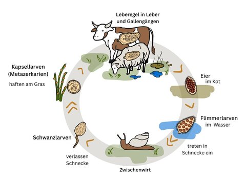 Da die infektiösen Larven des großen Leberegels bei Temperaturen über 30 °C absterben, ist bei Heißlufttrockung von Grünfutter eine sehr geringe Infektionsgefahr zu erwarten.