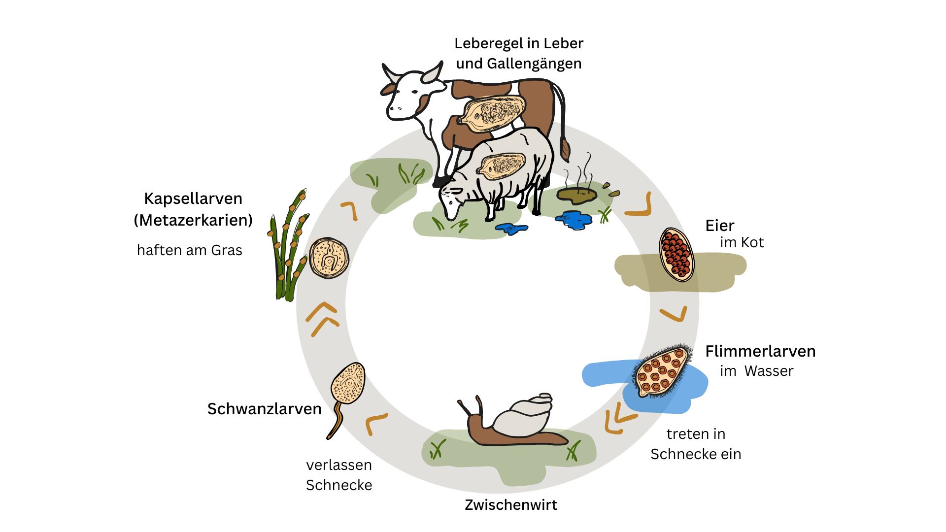 Der erwachsene Leberegel legt seine Eier in die Gallengänge des Wirtes (u. a. Rind, Schaf, Ziege) ab, diese gelangen mit dem Kot in die Außenwelt. Aus dem Ei schlüpft die Wimpernlarve, die schwimmend den Zwischenwirt (die Zwerglammschnecke Galba truncatula) aufsucht, in dem sich über mehrere Larvenstadien Schwanzlarven entwickeln, welche die Schnecke verlassen, um sich an Pflanzen als Kapsellarven festzumachen. Diese werden vom Wirt aufgenommen, gelangen in den Magen- Darm-Trakt, wo die jungen Leberegel ihre Hülle verlassen, in die Leber eindringen und dort sechs bis acht Wochen im Gewebe wandern. Am Ende der Wanderphase brechen die Leberegel in die Gallengänge ein, wo sie nach endgültigem Erreichen der Geschlechtsreife Eier produzieren. Die Zeit von der Aufnahme der Kapsellarve bis zur Eiausscheidung dauert beim Rind rund 8 Wochen.