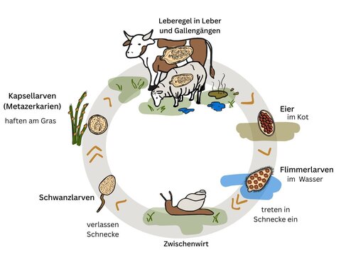Mehr dazu finden Sie in der Broschüre zur Leberegelbekämpfung beim Rind: https://www.wdk.vetmed.uni-muenchen.de/forschung/fasciola_hepatica/fluke.pdf) der LMU München.